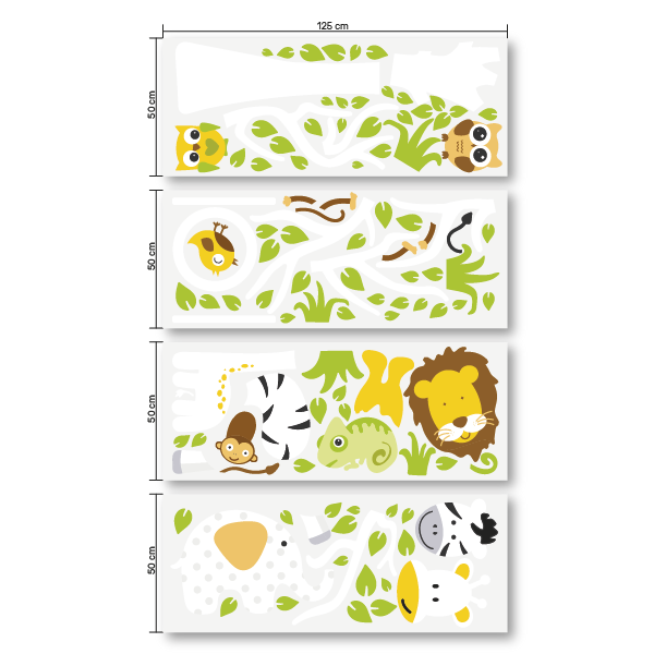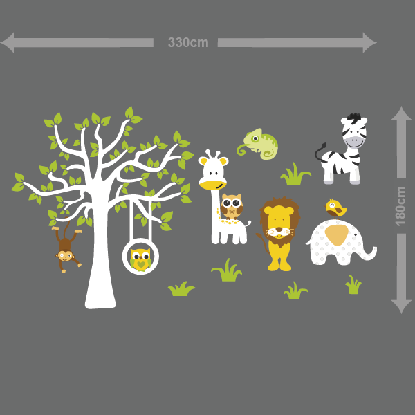 Állatok a tisztáson egész falas (330cm x 180cm) falmatrica. Ez a nagyméretű falmatrica tartalmaz állatokat, fűcsomókat, hintát és egy hatalmas fát levelekkel. A fa törzse és néhány állat fehér színű, ezért színes falra ajánljuk.