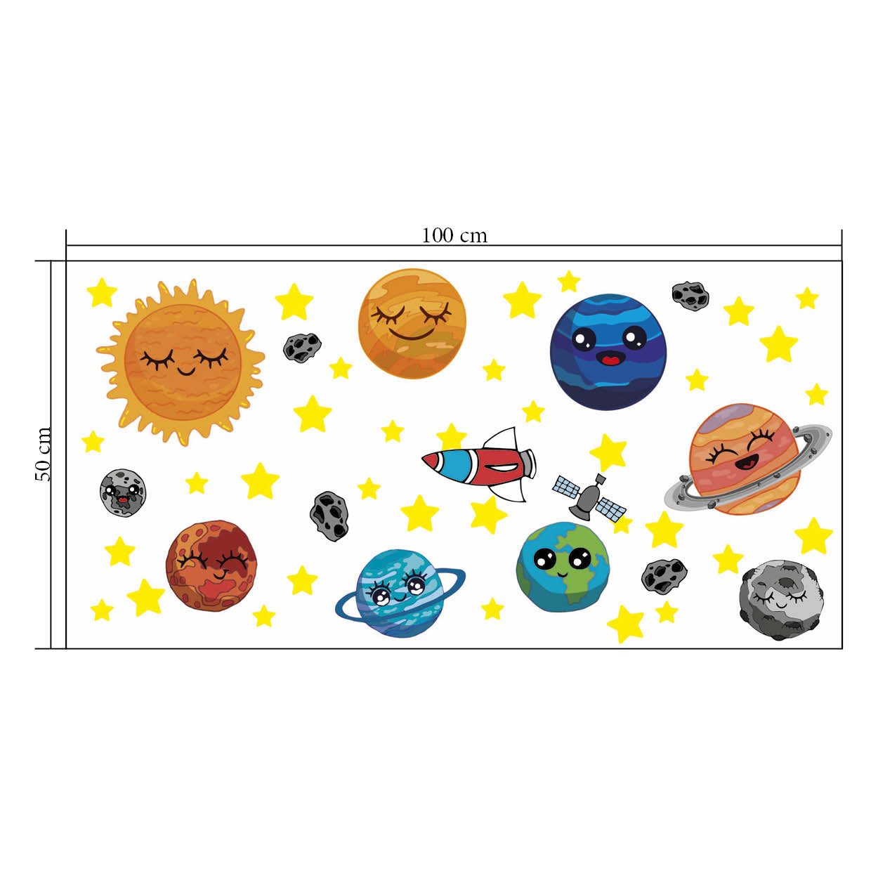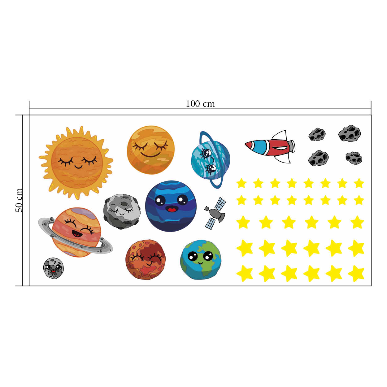A csomag összesen 49 db különálló matricát tartalmaz: nap, holdak, bolygók, aszteroidák, űrhajók és csillagok.
